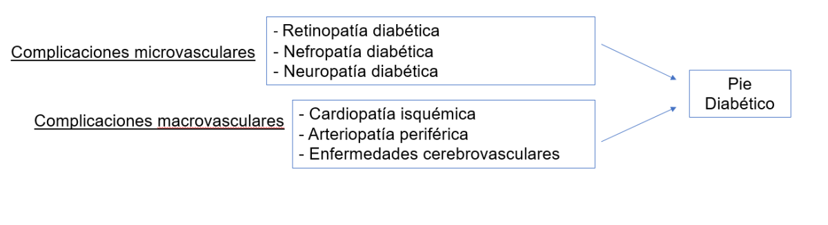 Todo ello derivado de la afectación en pequeños vasos (complicaciones microvasculares que producen: retinopatía, nefropatía y neuropatía diabética, que alcanza una prevalencia del 50%) y grandes vasos (cardiopatía isquémica, arteriopatía periférica, con una prevalencia del 25% y enfermedades cerebrovasculares).