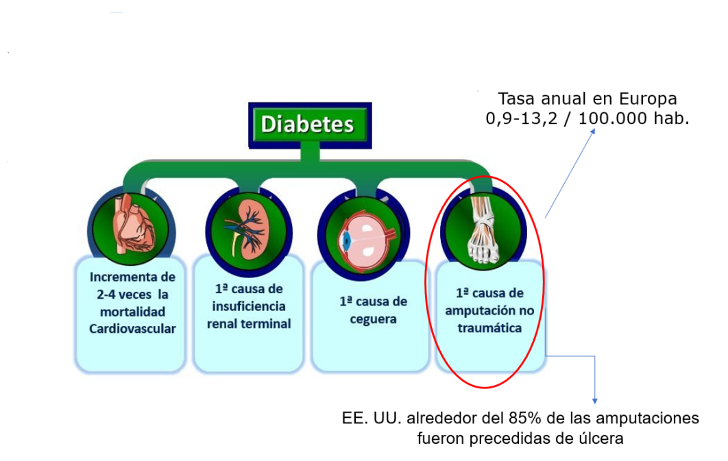 La diabetes incrementa 2-4 veces la mortalidad cardiovascular, es la 1ª causa de insuficiencia renal terminal, de ceguera y de amputación no traumática de MMII. (3)
