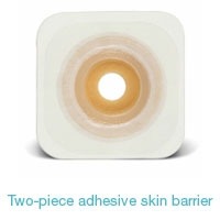 Two-piece adhesive skin barrierUna barrera de la piel se fija a su piel peristomal (alrededor del estoma), ayudando proteger su piel del efluente del estoma y fijando la bolsa a su cuerpo.