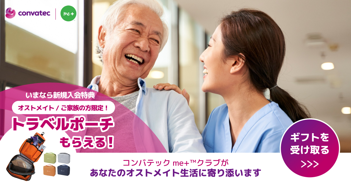 「コンバテックme+™クラブ」は、ストーマ保有者と支援者の方に寄り添います。ストーマケアなどのお役立ち情報や無料お悩み相談などでサポートします。今ならストーマ保有者の方・ご家族の方の新規無料入会で素敵なトラベルポーチをプレゼント!